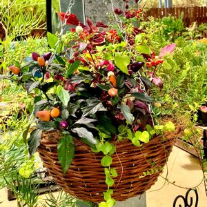 シックな色合いの 素敵なハンギング🌿 お気に入りの園芸店にて☺️💕 観賞用トウガラシやジュズサンゴなどのカラーリーフを ギャザリング風に植えてあり、 こちらも素敵で見入ってしまいました☺️🌿