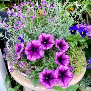 パープル系の寄植え💜 フレンチラベンダー、リナリア、 よく咲くスミレ、アリッサム、 ペチュニア、