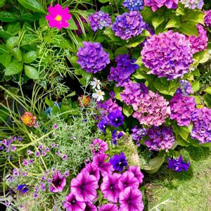 ペチュニアと紫陽花の ハンギング💕 紫陽花は色褪せて来ましたが アンティークな色合いになり 気に入ってます🐈🐾🌿