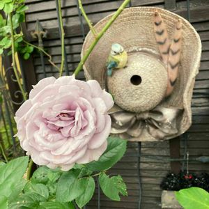 薔薇カインダブルーが 咲き始めました ハンギングの黒いビオラが 暑さで枯れてきたので、 違うのに差し替えする予定です