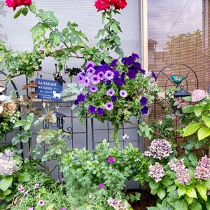 つる薔薇クリムゾングローリーが 咲きました。🌹 ハンギングのペチュニアが伸び伸びで暴れて来ました。 そろそろ切り戻しですね😊