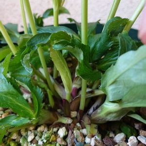 いつの間にかここも複数pic掲載できるようになったんですね。 ということで、先程の投稿に続いて、葉芽と花芽の違いについてpicを上げておきます。 1枚目:地際に出ているのが花芽(今年春に出た芽)になります。真ん中に巻いた葉がありますが、これがこの秋に出てきた葉芽です。いくつかまだ小さな芽が見えると思いますがこれは全部葉になるという理解で正しいです。 セオリーでは、秋の休眠明けにこういう葉芽を出さないのが良いとされていますが、そう、うまくいくはずもなく。この株は花芽6つに新しい葉芽が10個くらい出てます。😁 2枚目:先程の株の全体。上に伸びてる葉がこの秋出てきたもの。春に出た葉は全部落としてます。今年はこんな株が多いです。 3枚目:レッドクレオパトラですが、やっぱり葉芽と花芽が両方出ている感じです。花芽は3つ出ています。 4枚目:ダーククレオパトラですが、左側が花芽になり、右側が花芽にならずに葉が出てきたケースですね。(これがいわゆる花芽が葉芽になったと言われるケースです) クリローの場合、新しくでてきた葉が苞葉みたいな感じになると花芽ということなんですが、株が若いと分かりにくかったりするので、慣れないうちは、古葉切りは花の蕾確認してからでも良いかと思います。(花芽の古葉は切ったほうが良いですが、葉が出てきたものは切らない方が良いので。)