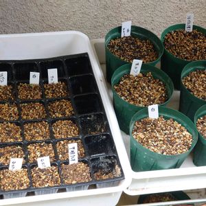 ここで発芽管理している種はほぼ全てクレオパトラです。👍 まだ20粒位、別で実験しているので全部で100粒近く撒いてます。(コソっと直売で入手した雅さんの種もいますけど、そこは見なかったことに。) 今回はセルフ交配、ホワイトゴールドとの交配、ソレイユとの交配の3種類の交配していますが、一部タグ無しになって、どれなのかわからない個体がおります。😁 こうなると咲かないとわからないわけで・・ 今回の白クレオパトラを狙う交配はホワイトゴールドをチョイスしました。該当株は過去花姿をここで紹介してますので気になる方は探してみてください。😀 一回目は透き通る系の白(シャル・ウィ・ダンス)使って交配しましたが、二回目はちょっとクリーム色に近いゴールドで、かつ種親も違うクレオパトラなので、違う雰囲気が出るかなと期待しております。(まぁ、確認できるのは3年後ですけど) 三回目の今シーズンは小輪レッドクレオの白バージョン狙いの交配をしようと思っております。 ちなみに種取りまくった親株は今季ステム2本です・・やはり種取りはほどほどに、という感じですね。😁