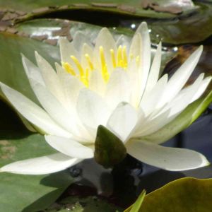 横浜四季の森公園 スイレン(白)、スイレン科スイレン属の水性多年草 🌼日本には(未草)ヒツジグサのみが古来から生育、ヒツジグサ以外は明治時代以降に輸入された園芸種、ヒツジグサは白い小柄な花です