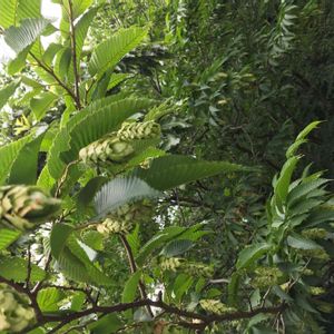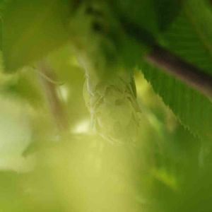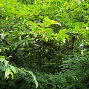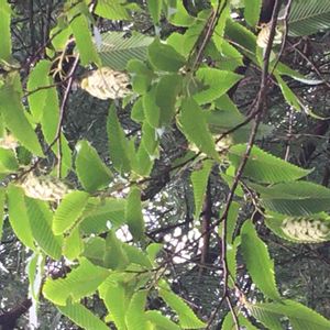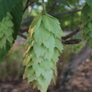 熊四手。材質が固いことから、カタシデとも。10〜15m級の落葉高木。シデのなかで果穂(葉が変形したもの)が太いことからクマと名付けられたようだ。シデは果穂からのイメージで、しめ縄などに付ける短冊状の白い紙をシデという。果穂は、果苞のなかに種子を抱き、それが集まって房状になったもの。ビールに使うホップの実に似ている。濃い緑の樹冠にあっても薄緑の果穂はよく目立ち、薫風にゆらゆらするのを下から眺めると、親しみが湧いてくる。果穂は秋には熟して褐色になる。 クマシデ属には他にイヌシデ、アカシデなどがある。葉の側脈が20〜24対と最も多く、葉の表面が無毛なのがクマシデ。あとはちょっと面倒ではあるが、樹皮の色、葉の表裏、花序、果穂などから同定していく。この時期がいちばん見つけやすいようだ。 ちょうどいいタイミングに出会えるかどうかで、奇縁にも無縁にもなる。