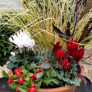 冬の寄せ植え1号は よくあるガーデンシクラメンですが、クリスマスのイメージで 植えてみました♪ 花材は サントリナ、トドナエア、チェッカーベリー等