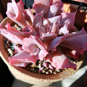 エケベリア属 「トランペットピンキー」 お正月からうちの子になりました✨ トランペットピンキーちゃんです。 📯状の葉っぱが面白いですね。 普通の形の葉っぱもあるんですよね。 変態していくのですかね。 ネットの写真だと、ブルー系の色をしていました。 過保護で、家の中に入れているから色が出てこないのでしょうかね? 多肉植物の分からない事が多いです。😅