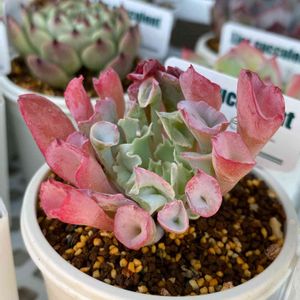 エケベリアです。 トランペットの様な形がまだまだ小さいピンキーさん。☺️フリルが多めです。ꉂ(ˊᗜˋ*)ヶラヶラ ピンク色は素敵なピンク。💓💗