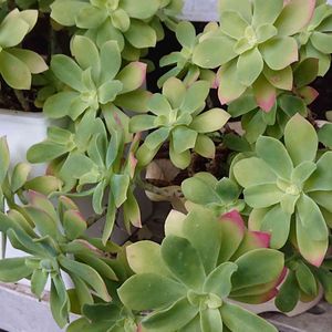 薄化粧。 3月辺りからベランダ&雨ざらし&直射日光。 紅化粧はエケベリアだけど、薄の方はセダムなのね。ややこしい。 右:2月 左:昨日 色は2月だなぁ。 現在化粧が取れて、スッピン(緑)。 気温が低くなると、化粧してくれるかなぁ。