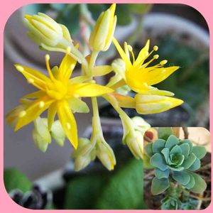 おはようございます💕 朝日がまぶしいくらいです(^^) 昨年春に産直市場の小さな多肉コーナーでみつけた薄化粧さん、お花が咲いてきました💖 買った時から、茎がビローンと伸びていましたが、垂れものが好きな私の好みにはピッタリ😁 暮れ頃から、足元に赤ちゃんが沢山生まれてますよ〜💕🤗