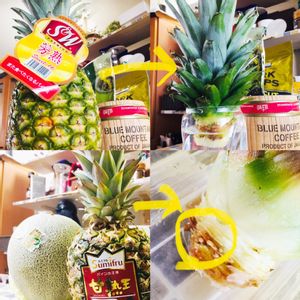 私もチャレンジ✨ パイナップルのヘタ植えてみる♪ 下の方が2.3日まえので、根が出てきてた♪ そうとも知らずにもう一個今日買ってきちゃって、2個目の水耕開始w どうなるかなぁ
