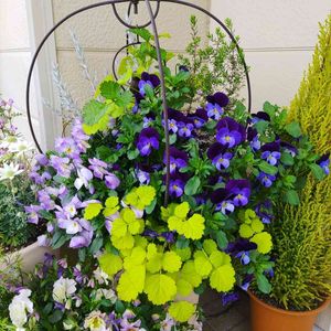 小鳥さんぶらぶらの寄せ植えアップ✨ 紫色のビオラがベルベットみたいな感じの色合いになって可愛いすぎる🎶