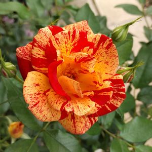 バラ きらり🌹 四季咲きの中輪房咲きで、木立樹形のフロリバンダ系統らしい姿をしています 祭り、万華鏡、ニメットと並ぶ我が家の黄色×赤系(ビタミンカラー)の絞り咲きバラの一つで、咲いた花を見ると元気になれます💪