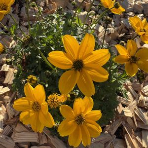 ウィンターコスモス 山吹色 この間も気になったけど 朝の小走り通勤で撮れず 朝日を背中に浴びて ちっちゃくいっぱい咲いてました