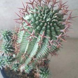 星のようなとげを出す、サボテンそっくりのユーフォルビアです。 「群星冠」として買いましたが、どうやら「秋星冠」のようです。あたたかくなったので、星のようなとげをぐんぐん伸ばしてきました。