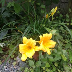 「ヘメロカリス」と思います✨🌼 我が家の庭で咲く黄色の花です💕 蕾がバンザイしています🎉🤣 ニッコウキスゲとして植えましたが、GS で正しい名前を教えていただきました😊 放ったらかしの地植えですが、毎年楽しませてくれます🎶😆 新:ツルボラン科ワスレグサ属 旧:ユリ科ワスレグサ属 別名 :「ヒメキスゲ(姫黄萓)」 「デイリリー(day‐lily)」 ✳︎ 日本に自生するニッコウキスゲ、ユウスゲ、ノカンゾウ、ヤブカンゾウなどを品種改良した園芸品種🧐 ✳︎ 一日花。「一日」を意味する「へメロ」と「美」と言う意味の「カロス」🧐