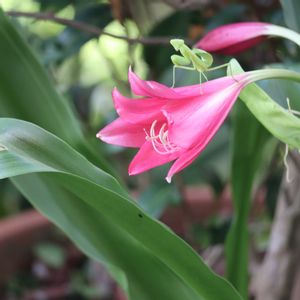 クリナムの花が未だ咲いてると 写真を撮ったら珍客の カマキリの赤ちゃんが写ってる❣️ 撮った時は全く 気づきませんでした( ´›ω‹`)💕