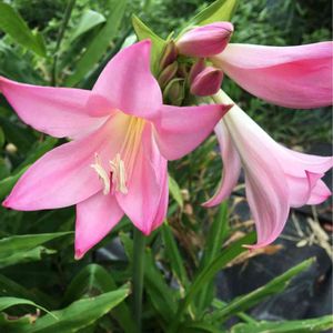 可愛い😍 ピンクの花 ミョウガしか、植えてないのに ミョウガの親の花?と 思いきや 教えてくださって ありがとう〜😊 不思議ね〜〜 きっと クリナムの花のようです🤣