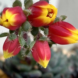 エケベリア属 ルンデリー💕 粒々で少し毛が生えている葉っぱ。 花は、赤と黄色で派手派手😅 昨年は、この姿に一目惚れして連れ帰ったんでした(^-^;