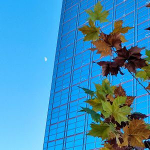 昨日、昼の月がキレイでした😍 オフィスビル街の憩いの場所、すずかけ公園から撮りました。 名前にふさわしく鈴懸が沢山植栽されてますが、落ち葉が大きくてお掃除大変。