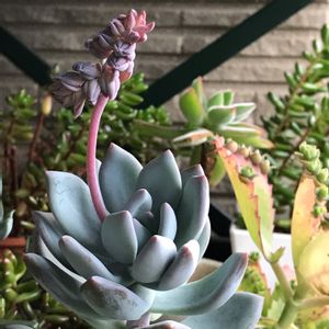 おはようございます。 今日は一日雨☔️のようですね 多肉棚から乙女心さん💕 先がピンク色になってきました。 毎年、ヒョロヒョロ伸びて 下葉が取れてしまいます💦💦 ワンちゃんの籠にはブレビフォリウム🎶 今日も素敵な一日になりますように🤗