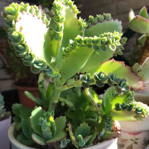 おはようございます🎶 子宝弁慶草🌿🌿 お子ちゃまがたくさん付いています😵 どんどん増えちゃう💦💦 鈴蘭のような釣鐘状のピンクのお花が 咲くんだとか🤔 まだ見たことがないのですが… お花見てみたいなぁ🙄🙄