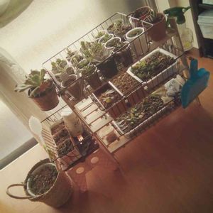 【日記】 『部屋とタニクと私』 我が家のタニクちゃん達は、東向きの窓側にいます。 本当はDYIな棚で外で育てたいのですが、ウチのコはまだ皆根っこが少ない(無いも含む)ので、外の気温に耐えることが出来ません(ノд-。)クスン 何度か根っ子が出たコを、夜間にベランダへ出してみました。 ・・・一発で蒸れた( ˘ •ω• ˘ ) 棚が欲しくて、ダイソーのスノコと結束バンドで簡易に棚を作ってみました。 現在、ノコギリとベイントとタッカーの使い方を練習中٩(。•ω•。)و ※写真はフィルター(LINEカメラ/フィルター『テンダー』)をかけました( ・∇・)