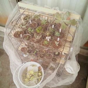 【日記】 『ベランダとタニクと私』 時間が合わず、9月は『お迎え記録』が書けないので、このまま『日記』でお茶を濁す日が続いております・・・。 我が家のタニクちゃん達は現在、ベランダへ引越ししました。 棚は使わなくなったワゴンのサイドの枠に、ダイソーのスノコをダイソーのクリップで留めただけの簡素な作りです。 粉塵&鳥よけに、ダイソーの『鳥よけ網』を掛けてます。 ※写真はフィルター(LINEカメラ付属)をかけました( ・∇・)