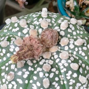 アストロフィツム 兜のでべそみたいな部分が膨らんで来ました。 どうやら蕾のようです。花色も白、黄、ピンクがあるみたい。 何色が咲くかな、楽しみです。 ホルスさんも花が待ち遠しくて下でお昼寝しています😴