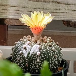 アレオーレが汚れたような色になり、形も扁平になってきていて、最近アップしなかったアストロフィツム 兜。 よく考えたら、この子をお迎えして6年以上たちます。☺ GSを始めた頃に園芸店で一目惚れした子です。😍 小さくて真ん丸で可愛かったのですが、直径も8cmくらいになり、渋みが出てきました❕ 腰折れが心配ですが、これからも大切に育てていこうと思います。😊💕