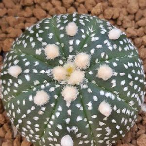 夏の間、ほとんど水をやらなかったので微妙に腰折れしてますが、なんとか乗り切ったかな? 補足 アストロフィツム属 兜丸は刺座と多数の白点。 瑠璃兜は白点が無くて刺座のみで緑っぼい。 瑠璃兜錦はこんな感じ。