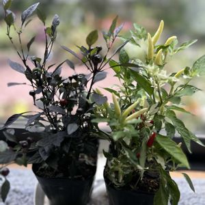 こんにちは☀️ 観賞用トウガラシ🌶️2種 暑い🥵ので室内で撮影 オニキスレッド⚫️🔴と 斑入り葉🌿が涼しげな ウチュウ クリームレッド🌶️🤍 🏷️2のつく日は斑入りの日 🏷️斑入り見つけ隊♪ No.22