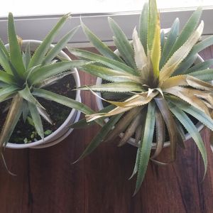 右側のパイナップル🍍瀕死、、😱😱 水やりし過ぎのようです、、 思えば、鉢皿に常に水が溜まってる状態になってました。 この前より黄色が広がってます、、 もうダメかもしれないけど、外に出せる気温になるまでこのまま見守ります😢