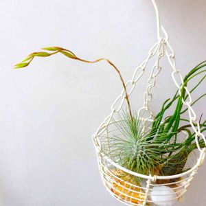オール100均グッズ(byセリア)で吊ってみました✨ ブッツィーはまだ小さくて枠の隙間から落ちそうだったので、1号素焼き鉢ごとハンギング。