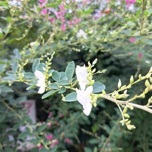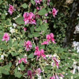 宮城野萩(ミヤギノハギ) マメ科ハギ属の落葉半低木。東北、北陸、中国地方の山野に自生する。日本海側に分布するケハギの園芸品種といわれる。庭や公園に植えられているハギはほとんどが本種。高さ1〜2m。枝は下垂して花期には先が地に接するほどになる。葉は互生。花期は7~10月。花は紅紫色。長さ約1.5㎝ほどの蝶形花で、旗弁が強く反り返る。果実は豆果。長さ約1㎝。種子は1個。 名前の由来は不明。宮城野は、現在の宮城県仙台市内にあった原野の名前である。『古今集』に宮城野のハギを詠んだ歌があり、古くはハギの名所として知られたことによりミヤギノハギの名が付いたという説があるが、実際には宮城野にはミヤギノハギは自生せず、ツクシハギが多い。かつての宮城野の地は現在、楽天イーグルスのホームスタジアムや陸上競技場などになっている。ミヤギノハギと宮城野との関係は不明だが、ミヤギノハギは宮城県の県花として親しまれ、県章はミヤギノハギの3出複葉を図案化したもので、平仮名の『み』を表している。また、ミヤギノハギは夏から秋にかけて咲くことから、ナツハギとも呼ばれる。ハギの名前の由来は、毎年春に根元の古い株から新しい芽を出すので、『生え芽(はえき)』『生え木』の意味でもあるという。漢字の『萩』は日本独自の訓読み(日本で作られた国字説もある)で、中国ではヨモギ属のことである。ちなみに、ハギには『花妻』という別名もあり、『万葉集』にも詠まれる。鹿がいつもハギに寄り添うことから、ハギの花を鹿の妻に見立てたことに因む。但し、鹿がハギに近づくのは、単にハギの花芽を食用としているから。ハギと鹿の取り合わせは和歌のほか、工芸品の意匠の題材としても繰り返し好まれる。 出典『樹木の事典 600種』『ボタニカルアートで楽しむ花の博物図鑑』『樹木 見分けのポイント図鑑』『草木の種子と果実』『樹木の名前』『同志社女子大学ホームページ』