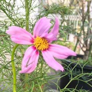 こぼれ種から発芽したコスモス、こんなに暑いのに咲き出しました。ちょっと歪んでいますね。🤔