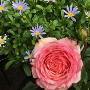 タマラコルダナさん💕 ハダニに罹患したミニバラさんが多い中 頑張ってくれている子🌹 でもちょっと傷んでる💧 切り戻しを重ね、小さなお花になってしまったブルーデージーさんに寄りかかって咲いています😀