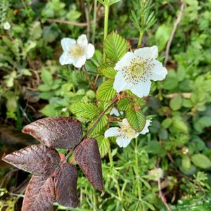 夕方の散歩で 真っ白な花姿と 花後のイガグリ坊主姿 グリーンの葉の間には 真っ赤に色づき始めた実 ポツポツ目立ち始めていました🍓 1️⃣〜4️⃣ 花から花後赤い実まで 可愛い😍 クサイチゴ 真っ白な花