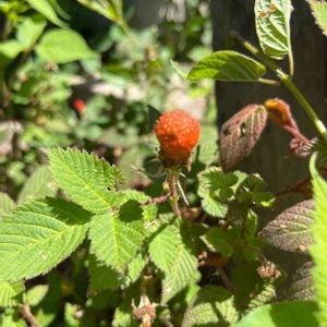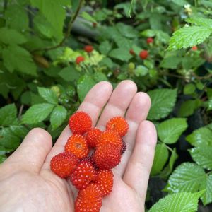クサイチゴとオオバライチゴを収穫しました、隠れていますが色が濃いのがオオバライチゴです。 味はクサイチゴの方が甘くて美味しいです。