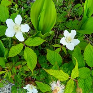 草苺が 真っ白な花を咲かせています 傍らには 蕾を付けた鈴蘭が、 2つとも 地下茎を伸ばして 増殖中