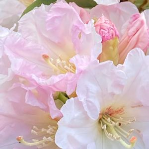 楽しみにしていたご近所の石楠花がたくさん咲き出しました🎶 薄紙のような花びらは優しい色です 花言葉は「荘厳、祈り」 🏷ピンクワールドへようこそ