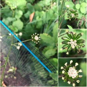 ノブキ 棍棒状に車輪のように並び、つぶつぶ腺体は粘り気があるひっつき虫( OдO) 葉は茎の株に集まって互生、蕗の葉に似ているというのが名の由来🟢葉の先は尖っていて、フキよりは随分小さい🟩 花は中央に両性花、周辺に雌花の白いぼんぼり(๑´`๑)♡ 今はすっかり落ちてしまって、周辺の雌花だけが結実して、個性的な形になる◉