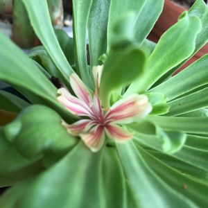 レウィシア、咲いてる〜😆、 えっ⁉️茎は❓ 茎のないまま、窮屈そうに1輪だけ 咲いてます。 なぜにこうなった⁉️ ナゾです😰