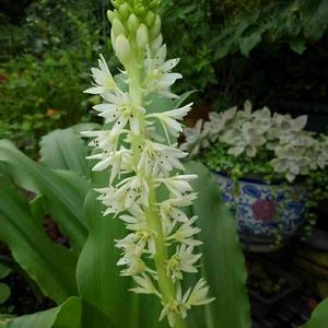 パイナップルリリーほぼ満開咲きです~😍 バックの朧月に草の様な物が垂れ下がってアクセントになってます🍀