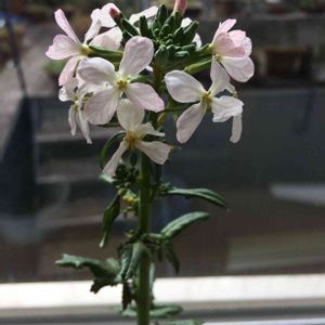 2月上旬に撮影。大根の葉の付け根を水栽培したら、淡いピンクぼかしの花を咲かせてくれました。