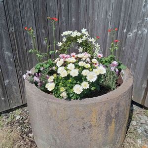古井戸の花壇 2回目の投稿です😹 ひょろっと長くて小さい赤い花🌼 大根花と書いてあったけど🤔🤔🤔 ほんとですか~🧐