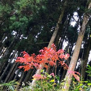 昨日の帰り道の一枚 鬱蒼とした杉林の前に 一本のハゼの赤✨❣️