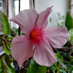 《マンデビラ・サンデリ》 つる性の常緑低木で、マンデビラの名前で流通する多数の園芸種の元となった原種マンデビラ🌼🌸 鉢植えでよく栽培され、ピンクや赤の花を咲かせます🤭 ダンディ邸の庭に毎年花を咲かせています🌸