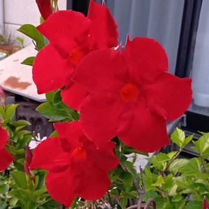 我が家のサンパラソル(マンデビラ属)咲き始めました 大輪種3種類のつもりが一つが中輪種でした😆 たくさん咲いてくれるといいなぁ✨