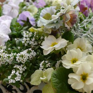 アンティークなブリキのバスケットを使ったロマンチックな寄せ植え♡°˖✧ ブリキに穴がないので、直接は植えてませんが、もう少しこんもりしてくると自然な感じになると思います✨
